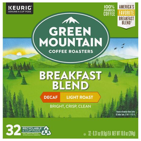 Green Mountain Coffee Roasters Coffee, 100% Arabica, Light Roast, Breakfast Blend, Decaf, K-Cup Pods - 32 x 0.31 Ounces