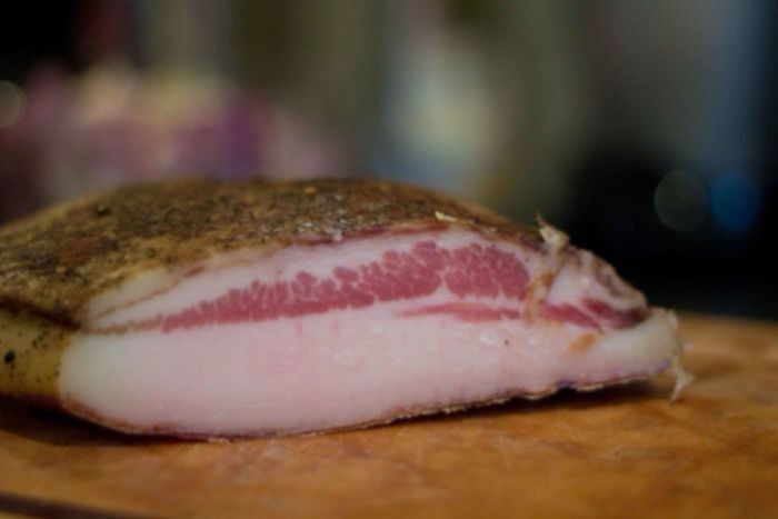 Air-cured, unsmoked pork delicacy made from pig jowls, guanciale ("gwan-chi-ah-lay") is a key staple in authentic Italian cooking. While pancetta and bacon are made from pork belly, guanciale, pronounced gwan-chi-ah-ly, comes from the pig's jowl or cheek (guancia). Unlike bacon, which is smoked, this fat takes its flavor from air-curing in wine and herbs.