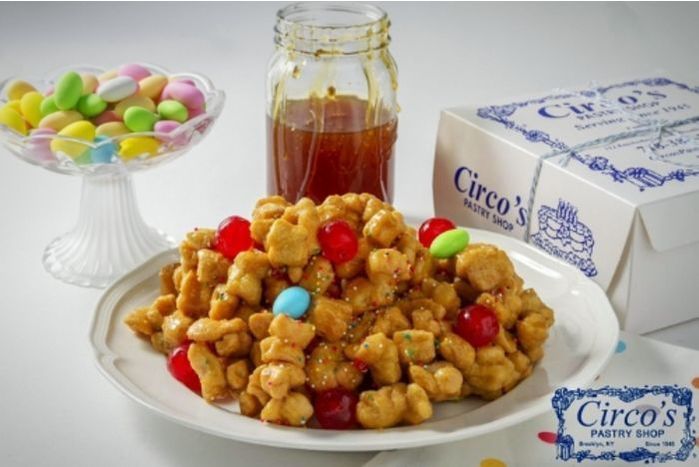Honey balls, also know as Struffoli and Pignolata. Deep fried balls of dough about the size of marbles. Crunchy on the outside and light inside. Then coated with honey, topped with sprinkles and Jordan Almonds. Circo's is known to make the best in Brooklyn.