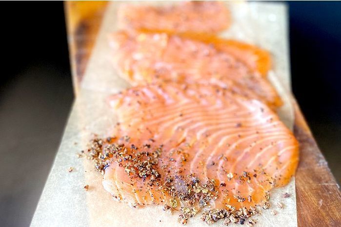 Crushed Juniper Berries + Muscovado sugar infused cold smoked salmon.