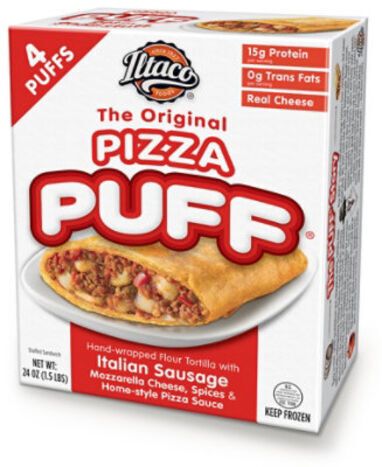 Tortilla; Flour (What Flour, Barley Flour), Water, Palm Oil, Baking Powder, Salt, Filling: Cooked Italian Pork Sausage (Pork, Salt, Fennel Seed, Black Pepper), Water, Mozzarella Cheese (Pasteurized Milk, Cheese Cultures, Salt, Enzymes), Tomato Paste, Palm Oil, Textured Vegetabl Protein (Soy Protein Concentrate, Caramel Color), Imitation Mozzarella Cheese (Water, Palm Oil, Casein [Milk Protein], Modified Food Starch, Wheat Potassium Citrate, Salt, Sodium Aluminum Phosphate, Lactic Acid, Sorbic Acid (as A Preservative), Artificial Color), Pizza Puff Seasoning (Spices, Garlic Powder, Salt, Paprika, Corn Oil and Less Than 2% Tricalcium Phosphate Added as A Processing Aid), Romano Cheese; (Pasteurized Cow's Milk, Cheese Cultures, Salt, Enzymes), Powdered Cellulose Added To Prevent Caking, Natamycin (A Natural Mold Inhibitor).
