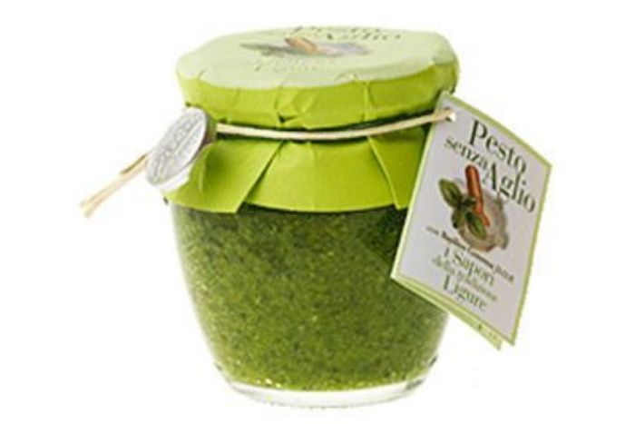 Genovese Basil Pesto without Garlic from Italpesto is made the best ingredients from the Ligurian region: delicious Genovese Basil DOP, high-quality, cold-pressed extra virgin olive oil, Parmigiano Reggiano DOP, Pecorino Romano DOP, crispy Italian pine nuts, walnuts and a bit of salt. This pesto is very creamy with an intense in the flavor.