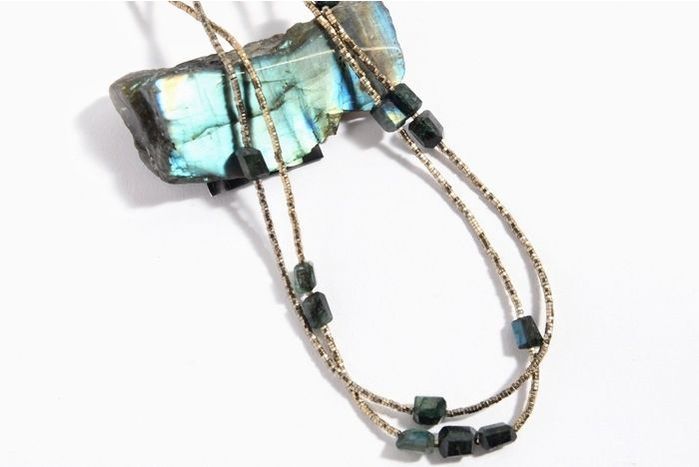 As simple and bold as the leaves on an ivy branch, this versatile design intersperses rough-cut labradorite - a healing stone known to protect against negativity - along a shining pyrite strand. Wear it long, double-wrapped or as a bracelet for a statement as unique as you.