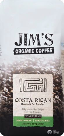 Jim's Organic Coffee Coffee, Whole Bean, Light Roast, Costa Rican Hacienda La Amistad - 12 Ounces