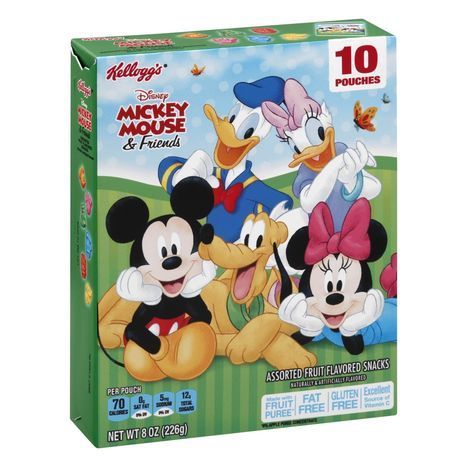 Naturally & artificially flavored. Naturally & artificially flavored. Per Pouch: 70 calories; 0 g sat fat (0% DV); 5 mg sodium (0% DV); 12 g total sugars. Fat free. Gluten free. Excellent source of vitamin C. Made with fruit puree (6% apple puree concentrate). www.kelloggs.com. how2recycle.info. www.disney.com. Questions or comments? Visit kelloggs.com. Call 1-800-358-1971. Provide production code on package. Certified 100% recycled paperboard.