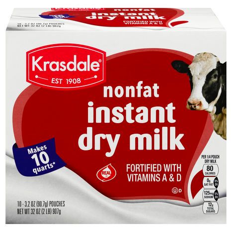 Per 1/4 Pouch Dry Milk: 80 calories; 0 g sat fat (0% DV); 125 mg (5% DV); 12 g total sugars. Foritified with vitamins A & D. Est 1908. Makes 10 quarts (Per 10 pouches). Real. krasdalefoods.com. Packed in USA.
