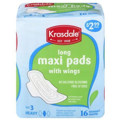 Ingredient List for Menstrual Pad: Polypropylene Nonwoven 3%, Fluff Core Wood Pulp 82%, Polyethylene Film 6%, Pad Glue 9%.
