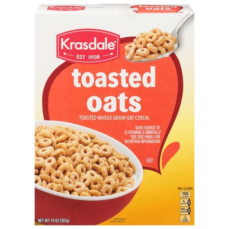 Toasted whole grain oat cereal. Per 1-1/4 Cups: 150 calories; 0 g sat fat (0% DV); 200 mg sodium (9% DV); 1 g total sugars. Good source of 12 vitamins & minerals (See side panel for nutrition information). BHT added to packaging to help preserve freshness. Est 1908. Start Your Day With the Right Stuff: Your parents always say that a big bowl of cereal is important, and they're right! When you don't eat breakfast, you're more likely to feel sleepy during the day and have a hard time paying attention in school. You can make a complete meal with fruit, milk and toast or a muffin. Of course, there are lots of fun ways to get the fuel your body needs! Dairy: Calcium helps build strong bones and teeth. Helps stop bleeding when you get a cut or scrape. Protein for strong muscles. Grains & Breads: Energy from carbohydrates. Fiber to help your digestive system. Fruits & Vegetables: Provides essential vitamins & minerals. Generally low in fat. This product is sold by weight, not volume. Some settling of contents may have occurred during handling and shipping. krasdalefoods.com. Packaged in USA.