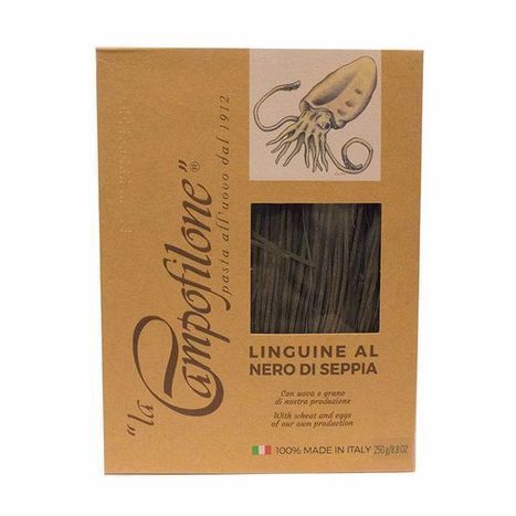 The Squid Ink Linguine from la Campofilone is made with Durum Wheat Semolina that grows in their field in the Marche region, Fresh Eggs from their farm and squid ink. La Campofilone squid ink Linguine is also bronze extruded, which gives the artisanal pasta a rough texture that better absorbs the sauce and is dried at low temperature for up to 18 hours for a better al dente bite. La Campofilone Squid Ink Linguine will conquer you at first taste!