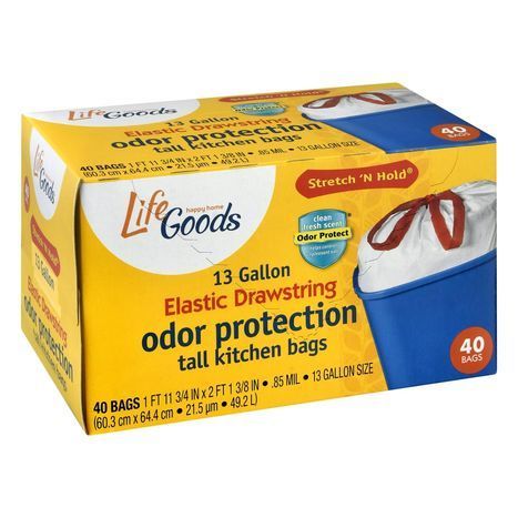 Life Goods Stretch 'N Hold Tall Kitchen Bags, Odor Protection, Elastic Drawstring, 13 Gallon - 40 Each