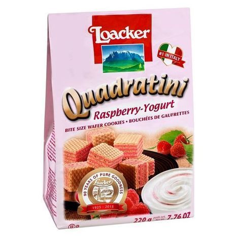 The Quadratini Raspberry Yogurt Wafer from Loacker is made with four layers of smooth raspberry yogurt cream filling, held by five light, crispy wafers. Sweet and tasty this bite-size wafer is enjoyed by kids and adults!