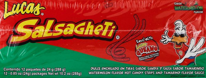 Candy Strips: Corn Syrup Wheat Flour Sugar Dextrose Sorbitol Citric Acid Vegetable Fat (Palm Fat) Chili Powder Glycerin Iodized Salt Wheat Fiber Artificial Flavor Sodium Lactate Lactic Acid Sodium Citrate Malic Acid Mono and Diglycerides Soy Lecithin Sodium Benzoate and Potassium Sorbate as Preservatives Color FD&C Red 40 Sauce: Water Iodized Salt Citric Acid Chili Powder Dextrose Modified Corn Starch Xanthan Gum Caramel Color Sodium Benzoate and Potassium Sorbate as Preservatives Ascorbic Acid (Antioxidant) Sucralose Artificial Flavor