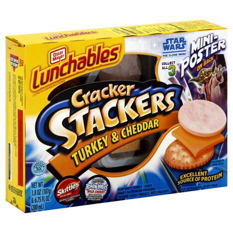 Cherry Flavored Water Beverage With Other Natural Flavor - Water, High Fructose Corn Syrup, Citric Acid, Sucralose (Splenda Brand Sweetener), Natural Flavor. Roast White Turkey - Cured - Smoke Flavor Added - White Turkey, Water, Potassium Lactate, Modified Corn Starch, Contains less than 2% Of Salt, Dextrose, Carrageenan, Sodium Phosphates, Sodium Diacetate, Sodium Ascorbate, Smoke Flavor, Sodium Nitrite, Natural and Artificial Flavor. Pasteurized Prepared Cheddar Cheese Product - Milk, Whey, Milk Protein Concentrate, Milkfat, Sodium Citrate, Salt, Lactic Acid, Sorbic Acid as a Preservative, Oleoresin Paprika (Color), Annatto (Color), Cheese Culture, Enzymes, Whey Protein Concentrate, With Starch Added for Slice Separation. Contains: Milk, Bite Sized Candies Natural And Artificially Flavored - Sugar, Corn Syrup, Hydrogenated Palm Kernel Oil, Apple Juice From Concentrate, less than 2% - Citric Acid, Dextrin, Natural and Artificial Flavors, Gelatin, Food Starch-Modified, Coloring (Includes Yellow 6 Lake, Red 40 Lake, Yellow 5 Lake, Blue 2 Lake, Blue 1 Lake, Yellow 5, Red 40, Yellow 6, Blue 1), Ascorbic Acid (Vitamin C). Crackers - Enriched Flour (Wheat Flour, Niacin, Reduced Iron, Thiamine Mononitrate (Vitamin B1), Riboflavin (Vitamin B2), Folic Acid), Soybean Oil, Sugar, Partially Hydrogenated Cottonseed Oil, High Fructose Corn Syrup, Salt, Leavening (Baking Soda, Calcium Phosphate), Whey (From Milk), Soy Lecithin (Emulsifier).