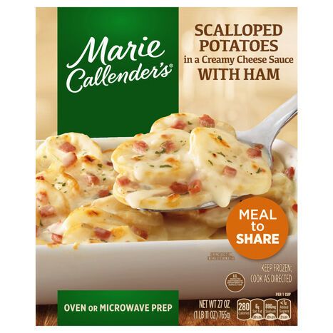 Scalloped Potatoes (Potatoes, Sodium Acid Pyrophosphate), Diced Ham Water Added (Cured with Water, Sugar, Salt, Potassium Chloride, Sodium Phosphates, Maltodextrin, Natural Flavors, Smoke Flavoring, Sodium Erythorbate, Sodium Nitrite), Water, Pasteurized Processed Swiss And American Cheese ([Swiss Cheese {Milk, Cheese Cultures, Salt, Enzymes}, American Cheese {Milk, Cheese Culture, Salt, Enzymes}, Water, Cream, Sodium Phosphate, Salt, Sorbic Acid], Potato Starch and Powdered Cellulose, Natamycin), Heavy Whipping Cream, Onions, Butter (Cream, Salt), contains 2% or less of: Spices, Soybean Oil, Modified Food Starch, Nonfat Dry Milk, Chicken Base (Chicken Meat with Juices, Salt, Chicken Fat, Sugar, Hydrolyzed [Corn and Wheat Gluten, Soy] Protein, Whey, Maltodextrin, Yeast Extract, Flavoring, Disodium Inosinate & Disodium Guanylate, Extractives of Turmeric and Annatto), Salt, Xanthan Gum, Guar Gum.