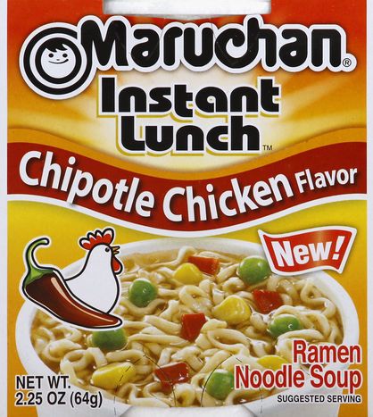 Enriched Wheat Flour (Wheat Flour, Niacin, Reduced Iron, Thiamine Mononitrate, Riboflavin Folic Acid), Vegetable Oil (contains one or more of the following: Canola, Cottonseed, Palm) Preserved by TBHQ, Salt, Dehydrated Vegetables (Corn, Green Peas, Red Bell Pepper, Garlic, Onion), Sugar, contains less than 2% of: Monosodium Glutamate, Chipotle, Paprika and Other Spices, Natural and Artificial Flavors, Maltodextrin, Yeast Extract, Hydrolyzed Corn, Wheat and Soy Protein, Xanthan Gum, Chicken Fat, Powdered Cooked Chicken, Potassium Carbonate, Citric Acid, Sodium Mono, Hexameta, and/or Tripoly) Phosphate, Sodium Carbonate, Soy Sauce (Water, Wheat, Soybeans, Salt), Caramel Color, Turmeric, Disodium Guanylate, Disodium Insinuate, Lactose, Silicon Dioxide (Anti-Caking Agent), Chicken Broth, Soya Lecithin.