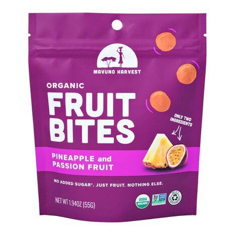 Our fruit bites are perfect for on-the-go snacking, as a healthy alternative to candy or chips, or as a topping for yogurt or oatmeal. They're also a great option for lunchboxes, picnics, or as a post-workout snack. [Description Provided by Mavuno Harvest.] Organic Dried Pineapple, Organic Passion Fruit.