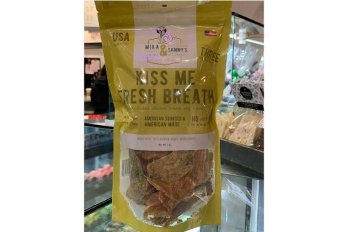 Dehydrated Chicken Breast Jerky Treats made with 100% all natural, all American, human intended chicken breast, fresh squeezed lemon juice sourced from organic lemons and topped with fresh cut organic parsley.