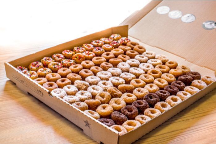 18" pizza box of 100 mini doughnuts. Flavors include Urban Monkey, Lemon pop, Green tea buzz, Cinnamon sugar, and Fruity cereal.