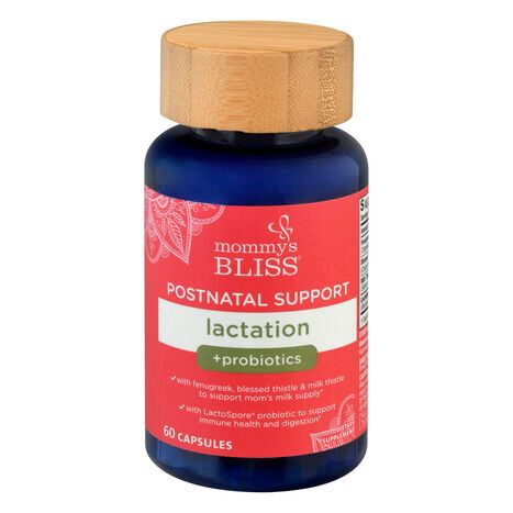 Dietary Supplement. No dairy, gluten, or soy. With fenugreek, blessed thistle & milk thistle to support mom's milk supply. With LactoSpore probiotic to support immune health and digestion. Postnatal Support Lactation: As moms, we know the struggle to keep up your milk supply. Our lactation capsules support your milk production with fenugreek, blessed thistle and milk thistle, plus added probiotics to support immune and digestive health. Our concentrated formula helps you get the benefits of fenugreek in fewer capsules per day. Formulated by a lactation specialist. Small, easy to swallow capsules. Free from artificial flavors & colors mommysbliss.com. (These statements have not been evaluated by the Food and Drug Administration. This product is not intended to diagnose, treat, cure, or prevent any disease.)