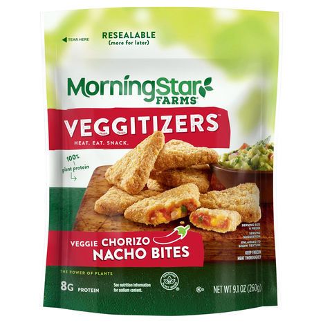 Flavors from natural sources. 8g protein. Vegan. Colors from natural sources. Made with Non-GMO soy. New. Heat. Eat. Snack. 100% plant protein. Serving size 6 pieces. The power of plants. morningstarfarms.com. how2recycle.info. Questions or Comments? Visit: morningstarfarms.com. Call: 1-800-962-0120. Provide production code on package. What's the deal with complete protein, you ask? Find out more at: morningstarfarms.com. P.S. there's a fail-proof recipe there, too! There are more bite-sized veggie eats where these came from. Perfect for entertaining, an after school snack, or an anytime appetizer. Try our other Veggitizers tonight! MorningStar Farms Veggitizers Veggie Pepperoni Pizza Bites. MorningStar Farms Veggitizers Viggie Chik'N & Cheese Taquito Bites. MorningStar Farms Veggitizers Veggie Buffalo Wings. MorningStar Farms Veggitizers Veggie Popcorn Chik'N. Resealable (more for later). how2recycle.info.