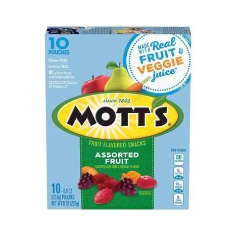 Mott's Fruit Flavored Snacks are made with natural flavors and colors from natural sources for a tasty treat that combines real fruit and vegetable juice with the fruit flavors kids love. You've finally found the perfect after-school snack that's a win for both you and your kids! [Description provided by Mott's.] Corn Syrup, Sugar, Modified Corn Starch, Pear Juice Concentrate, Apple Juice Concentrate, Strawberry Puree, Carrot Juice Concentrate. Contains 2% Or Less Of: Fruit Pectin, Citric Acid, Vitamin C (Ascorbic Acid), Dextrose, Sodium Citrate, Malic Acid, Potassium Citrate, Sunflower Oil*, Vegetable And Fruit Juice Added For Color, Natural Flavor, Carnauba Wax. *Adds A Trivial Amount Of Fat.