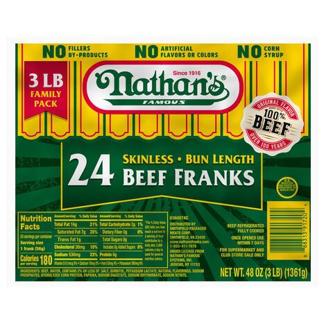 Nathan's Famous Skinless Bun Length Beef Franks Family Pack - 24 Franks