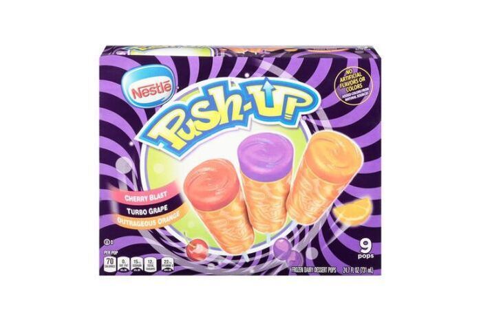 Orange Push Up: Water Sugar Corn Syrup Cream Milk Citric Acid Whey Guar Gum Natural Flavor Ascorbic Acid (Vitamin C) Mono and Diglycerides Tragacanth Gum Carob Bean Gum Polysorbate 80 Turmeric Oleoresin Color Gum Arabic Pectin Modified Corn Starch Xanthan Gum Isomalt Dextrose Beta Carotene Color Corn Starch Cherry Push Up: Water Sugar Corn Syrup Cream Milk Citric Acid Whey Beet Juice Color Cherry Juice Concentrate Guar Gum Ascorbic Acid (Vitamin C) Natural Flavor Polysorbate 80 Mono and Diglycerides Tragacanth Gum Carob Bean Gum Pectin Xanthan Gum Annatto Color Dextrose Grape Flavored Push Up: Water Sugar Corn Syrup Cream Milk Grape Juice Concentrate Citric Acid Whey Beet Juice Concentrate Color Guar Gum Ascorbic Acid (Vitamin C) Natural and Artificial Flavor Mono and Diglycerides Carob Bean Gum Polysorbate 80 Pectin Dextrose