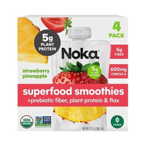 Bright and energizing strawberries and pineapple deliver vitamin C and an instant mood boost in one convenient, on-the-go pouch. Sweet enough for palates of all ages, this blend packs antioxidants and vitamins from five fruits, protein from plants and omega-3s from flax. Stash one in your bag for a nourishing tropical treat anytime, anywhere. [Description Provided by Noka.] Banana*, Strawberry*, Apple*, Water, Pineapple Juice Concentrate*, Brown Rice Protein*, Flax Seeds*, Soluble Tapioca Fiber*, Lemon Juice Concentrate*, Natural Flavors*, Camu Camu*. *Organic.