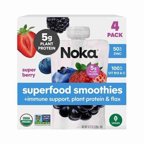 A light and refreshing pick-me-up on-the-go made with organic fruits, plant protein and immunity boosting ingredients (elderberry, vitamin & mineral blend delivering 100%DV of Vitamins B12 & C, 30%DV of Vitamin D and 50%DV of Zinc). [Description Provided by Noka.] Banana*, Berry Blend (Strawberry, Blueberry, Blackberry)*, Water, Brown Rice Protein*, Flax Seeds*, Elderberry Extract Powder*, Lemon Juice Concentrate*, Natural Flavors*, Ascorbic Acid (Vitamin C), Zinc Gluconate, Vitamin D3, Vitamin B12. *Organic.