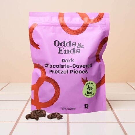 In the process of coating pretzels in delicious dark chocolate, a good portion of them are broken. These broken pretzel pieces and parts often end up going to waste because they aren't as aesthetically pleasing as a whole pretzel. But as it turns out, a smaller, broken pretzel covered in dark-chocolate achieves the perfect golden ratio of salty and sweet, making our broken Dark Chocolate Covered Pretzels even more delicious than the original. If ever there was a snack to feel good about, it's this one. Dark Chocolate (Sugar, Chocolate Liquor [Processed With Alkali], Cocoa Butter, Milk Fat, Soy Lecithin [An Emulsifier], Vanilla Extract), Pretzels* (Unbleached Enriched Wheat Flour [Wheat Flour, Niacin, Iron, Thiamine Mononitrate, Riboflavin {Vitamin B2}, Folic Acid], Malted Barley Flour, Salt, Soybean Oil). *Upcycled Ingredients
