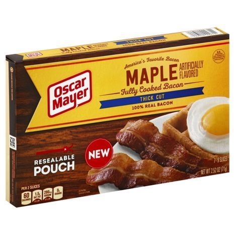 7-9 slices. 100% real bacon. Artificially flavored. America's favorite bacon since 1924. Per 2 Slices: 60 calories; 1.5 g sat fat (8% DV); 280 mg sodium (12% DV); 0 g sugars. US inspected and passed by Department of Agriculture. New. Resealable pouch. Slices may settle during shipping. 100% real bacon made from carefully selected cuts for premium quality. No prep necessary - have bacon any time, any day, anywhere! Smoked with natural hardwoods for great tasting, quality bacon. Pork raised without hormones. Federal regulations prohibit the use of hormones in pork. The ultimate pairing with: breakfast sandwiches; egg dishes; hash browns; and more. Also try: fully cooked bacon, original. For delicious recipe ideas visit kraftrecipes.com. Visit us at: oscarmayer.com. 1-800-222-2323. Please have package available. Please recycle this carton.