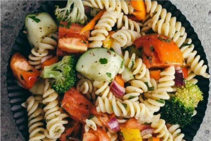 Spirelli Pasta, Cucumbers, Plum Tomatoes, Celery, Red & Yellow Peppers, Broccoli, Red Onions, Carrots, Parsley, Salt, Pepper, Olive Oil, White Balsamic Vinegar, Oregano.