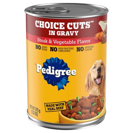 Food for dogs. Made with real beef. Really good food for dogs. Our Promise: Complete satisfaction guaranteed 1-800-525-5273. Feed the good. Dogs bring out the good in us. Pedigree brings out the good in them. To learn more visit us at Facebook.com/Pedigree. Made in the USA with world's finest ingredients. Calorie Content (Calculated): 752 kcal ME/kg 282 kcal ME/can. Pedigree Choice Cuts in Gravy Steak & Vegetable Flavor is formulated to meed the nutritional levels established by the AAFCO Dog Food Nutrient Profiles for maintenance.