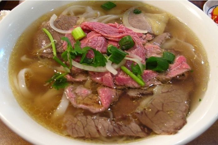 Beef bones blanched and simmered overnight with charred ginger, onions, star anise, cinnamon, cardamon, and then seasoned to taste with fish sauce and rock sugar. Add some thinly sliced eye round, noodles, and herbs for the complete meal!