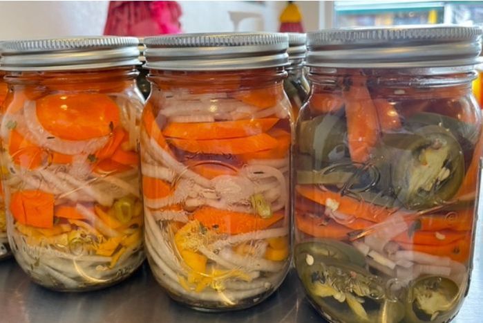 Pickled jar with hot peppers and veggies