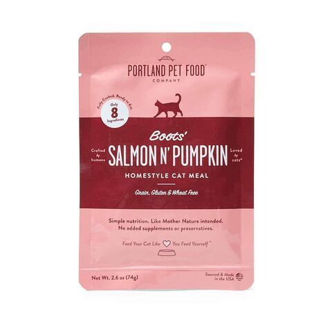 Rescued as a kitten, Boots was always grateful for the warm cozy spots in the house. She was known for her love of hunting and showing off her prizes proudly, much to the displeasure of her humans! She thrived off of PPFC in her final year, serving as the inspiration for the Salmon N' Pumpkin meal. [Description Provided by Portland Pet Company]. Salmon, Salmon Broth, Pumpkin Puree, Egg, Vegetable Oil, Potato Flour, Sea Salt, Eggshells.