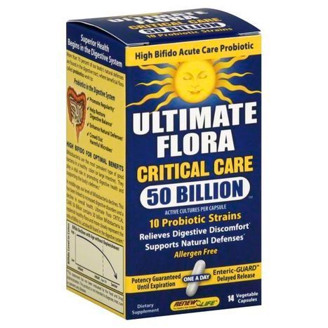 Ultimate Flora Critical Care Blend: Bifidobacterium Lactis Lactobacillus Acidophilus Bifidobacterium Breve Bifidobacterium Longum Lactobacillus Casei Lactobacillus Plantarum Lactobacillus Paracasei Lactobacillus Salivarius Lactobacillus Rhamnosus Lactobacillus Bulgaricus Other Ingredients: Vegetable Fiber and Water