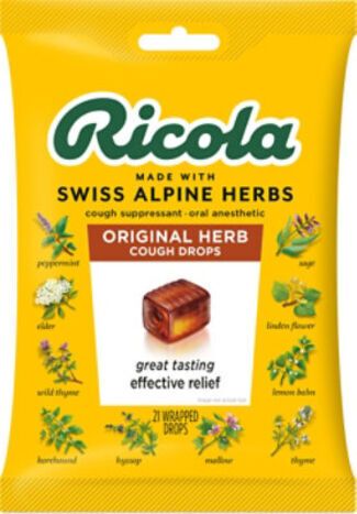 In Each Drop: Active Ingredients: Menthol (4.8 mg), Cough Suppressant, Oral Anesthetic. Inactive Ingredients: Color (Caramel), Extract of a Ricola Herb Mixture (Elder, Horehound, Hyssop, Lemon Balm, Linden Flowers, Mallow, Peppermint, Sage, Thyme, Wild Thyme), Natural Flavor, Starch Syrup, Sugar.