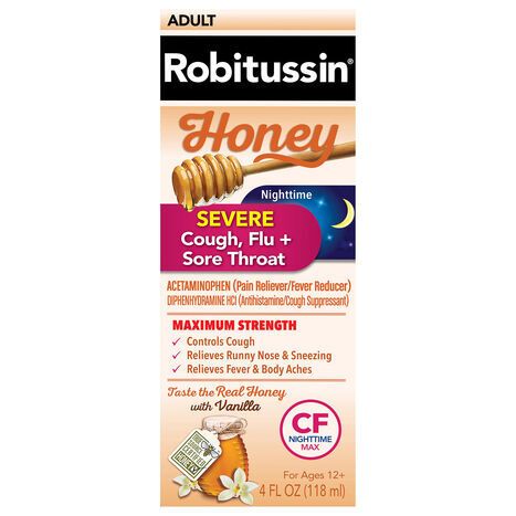 Robitussin Severe Nighttime Maximum Strength Honey Cough Flu + Sore Throat - 4 Fluid Ounces
