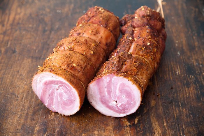 The same process used for our Rolled Garlic Bacon is used here, but instead of being covered in garlic it is dry-rubbed with a paprika based spice blend.
