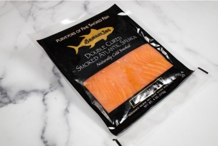 Cold smoked by Samaki Smoked Fish in Port Jervis, NY. Pre-sliced, this smoked salmon has a mild smoke and strong saltiness, which is a result of double curing before smoking. The texture is firm and full.
