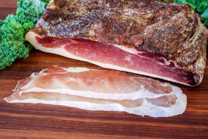 Smoked cured ham from the Alto Adige region of Italy, Speck is an extremely lean whole pork flank with a distinctive flavor. It can be served sliced thin on an antipasto platter or used to flavor bean soups, stews, and pasta sauces.
