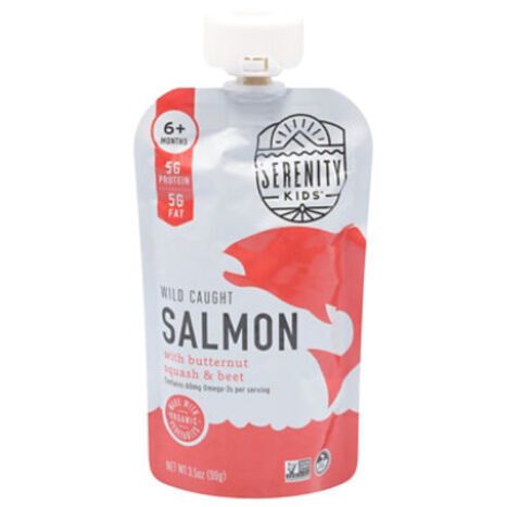Contains 72 mg DHA/EPA Omega-3s per serving. Made with organic butternut squash & beet. Certified Organic by Oregon Tilth. Paleo. Non GMO Project verified. nongmoproject.org. Made with 100% wild caught coho. Wild caught. Serenity Kids makes baby food for conscious families. Wild Caught Salmon: Our Coho Salmon is sustainably caught by fishing families in the waters of Alaska. We test it to ensure it's mercury-free and contains 72 mg of DHA & EPA Omega-3s per serving. With Veggies: Each pouch contains 1/3 cup organic vegetable to create hearty meals that taste great and leave your baby full, happy, and serene. www.myserenitykids.com. Family farms matter. A portion of our profits go to support the Farm-to-Consumer Legal Defense Fund. Learn more at www.farmtoconsumer.org. BPA-free package.