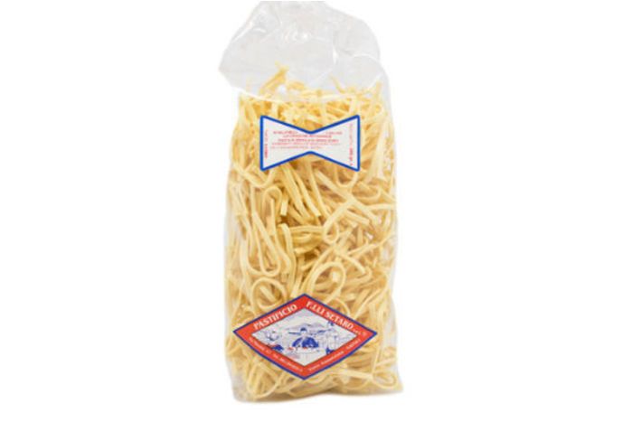 Scialatielli is a flat pasta that originally is sourced from the Amalfi Coast. It has a curvy, irregular shape that contributes to the flavor of dishes prepared with clams and seafood. 1.1 lbs.