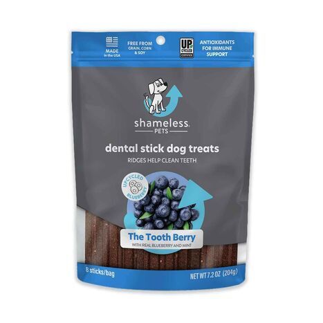 There's a new fairy in town. One that is berry, berry good at helping your pup keep their teeth clean and breath fresh. Berries also mean antioxidants that provide immune support. [Description Provided by Shameless Pets]. Sunflower Meal*, Chickpea, Tapioca, Coconut Glycerin, Blueberry*, Chia Seeds, Flaxseed Meal, Apple Cider Vinegar, Citric Acid (A Preservative), D-Alpha-Tocopheryl Acetate (Vitamin E), Mint *Upcycled.