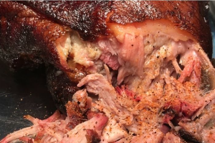 Pork Shoulder smoked, seasoned, and pulled to
