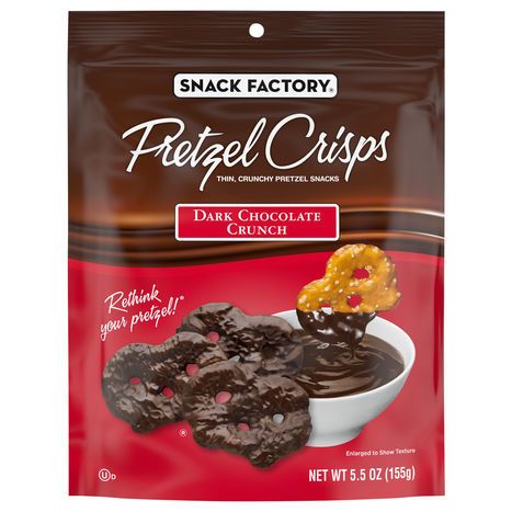 Thin, crunchy pretzel snacks. Rethink your pretzel! Treat yourself to our doubly delicious Dark Chocolate Crunch Pretzel Crisps. We've dipped our thin and irresistibly crunchy Pretzel crisps in velvety rich dark chocolate to create a perfect blend of savory and sweet. Try them frozen, or top them with your favorite ice cream for an extra special treat. One bite and you'll rethink your pretzel! Facebook. Twitter. Instagram. Pinterest. PretzelsCrisps. www.pretzelcrisps.com. Made in USA.