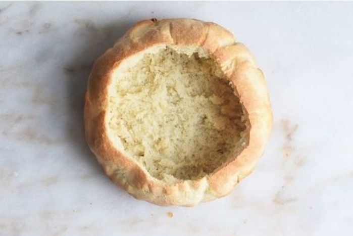 Whole fresh-baked sourdough bread bowl ready to cut and fill with your favorite chowder.