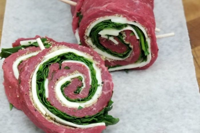 A home run addition to any grill get-together! This USDA Prime Flank Steak is rolled up with mozzarella, spinach, garlic, salt, pepper and breadcrumbs. For easy grilling, it is skewered and sliced into pieces about a quarter pound each. Medium heat, on the grill, for a few minutes on each side and the crowd will go wild.