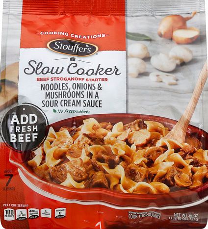 Sauce: Water, Sour Cream (Cultured Cream, Nonfat Milk), Skim Milk, Soybean Oil, Modified Cornstarch, Salt, Beef Broth, Beef Stock, Tomato Paste, Soy Sauce (Water, Wheat, Soybeans, Salt), Vinegar, Molasses, Onion Powder, Spices, Tamarind, Natural Flavor, Sugar, Garlic, Onions, Caramel Color. Onions and Mushrooms. Cooked Enriched Noodles: Water, Enriched Durum Semolina (Durum Semolina Wheat Flour, Niacin, Ferrous Sulfate, Thiamine Mononitrate, Riboflavin, Folic Acid), Eggs, Wheat Gluten.